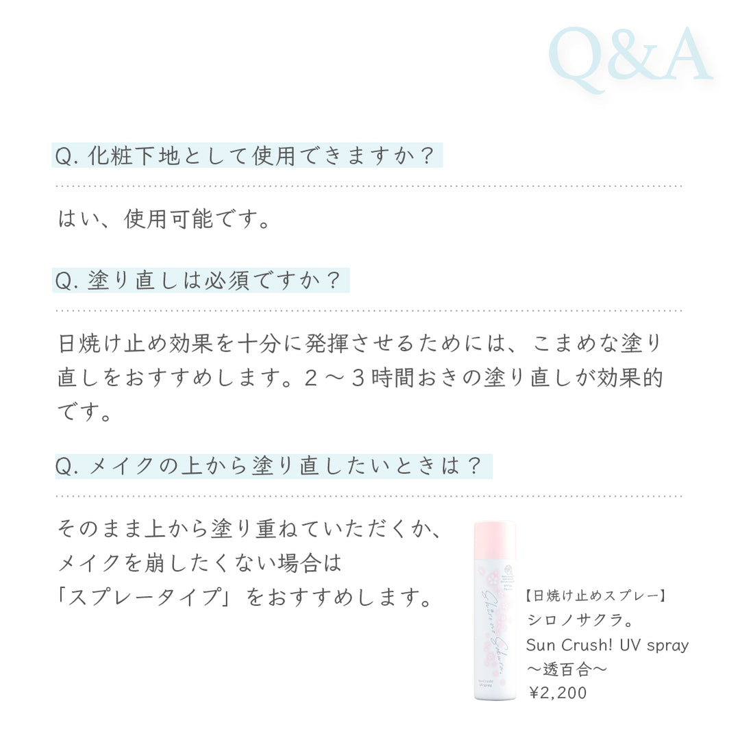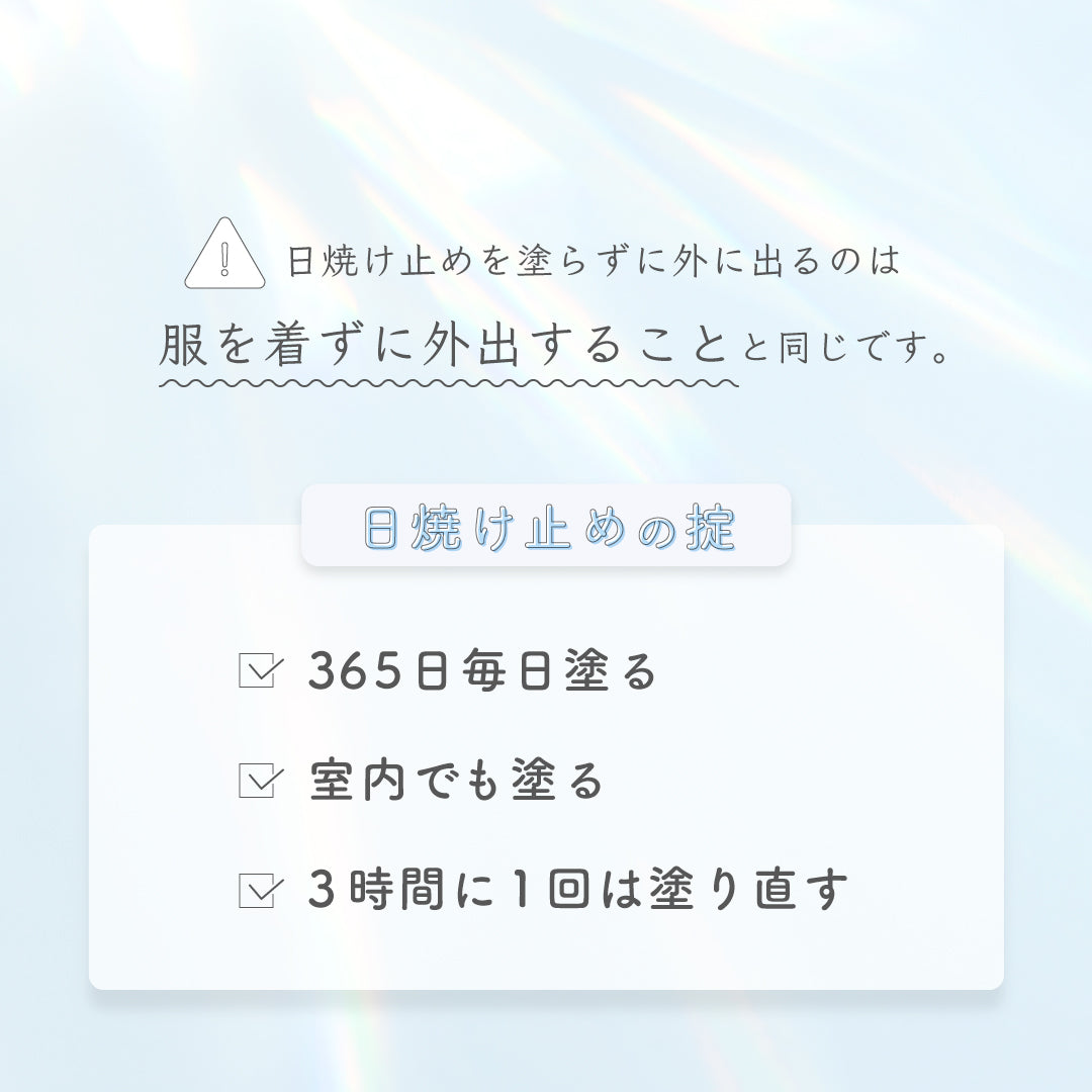 日やけ止め効果を十分に発揮させるためには、こまめな塗り直しをお勧めします。2~3時間おきのご使用が目安になります。