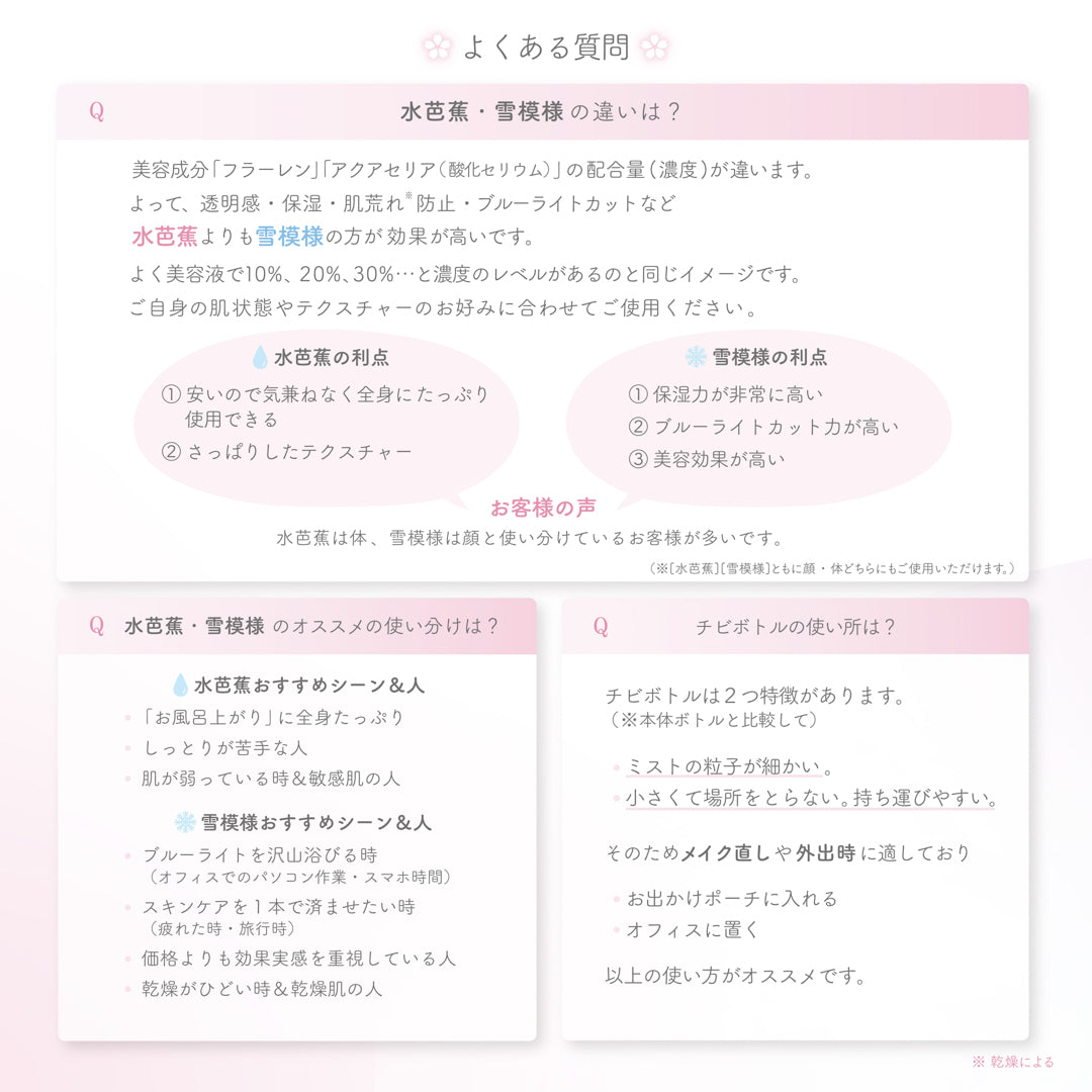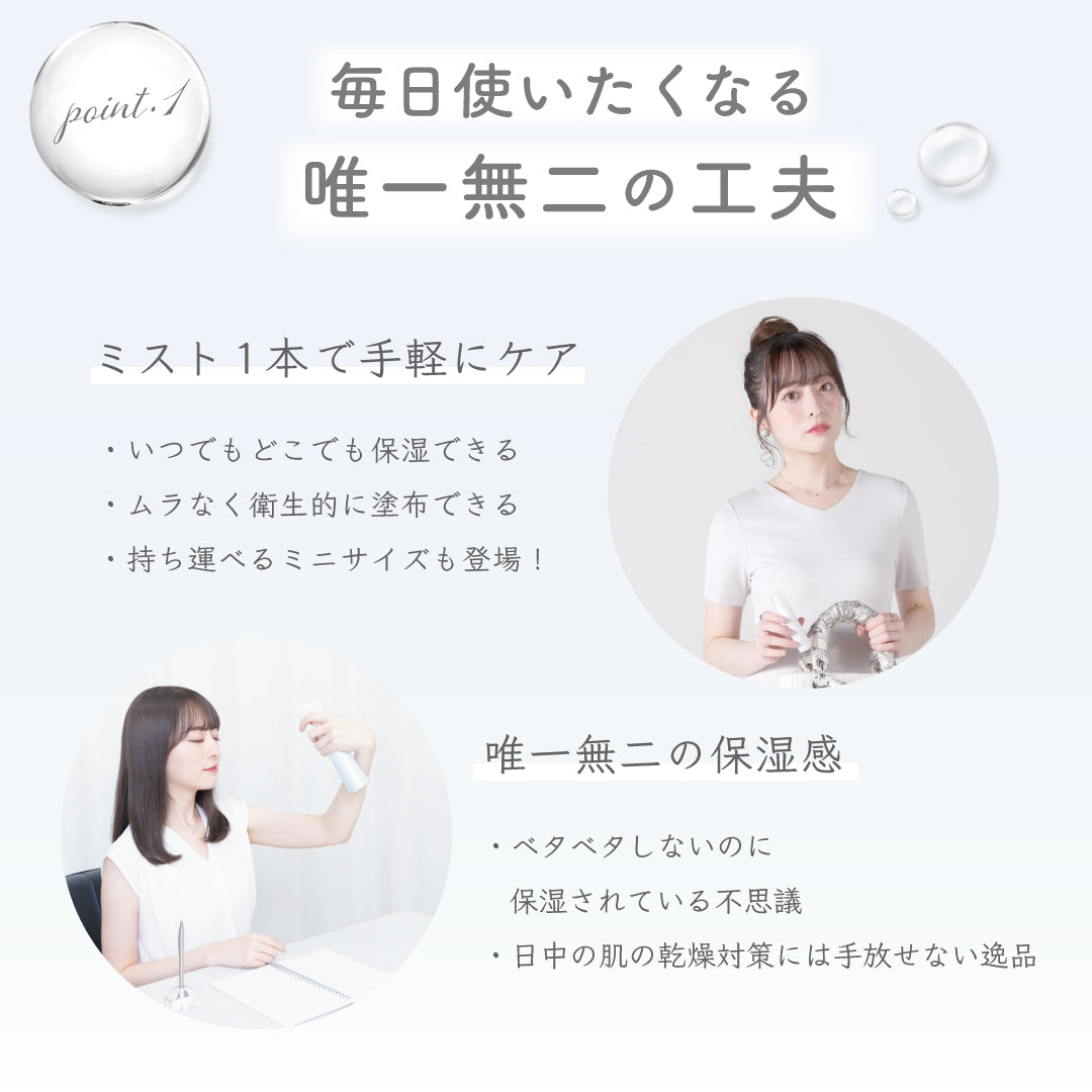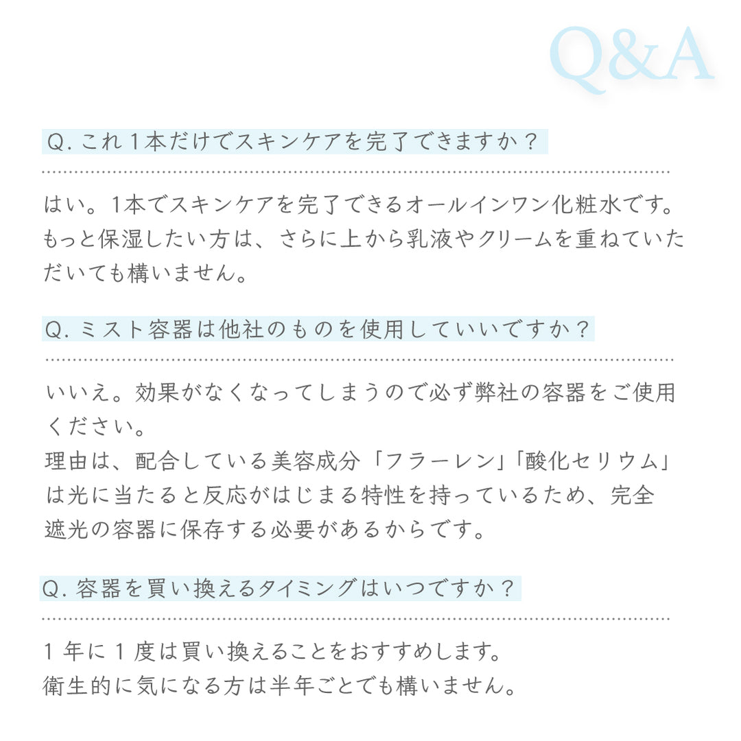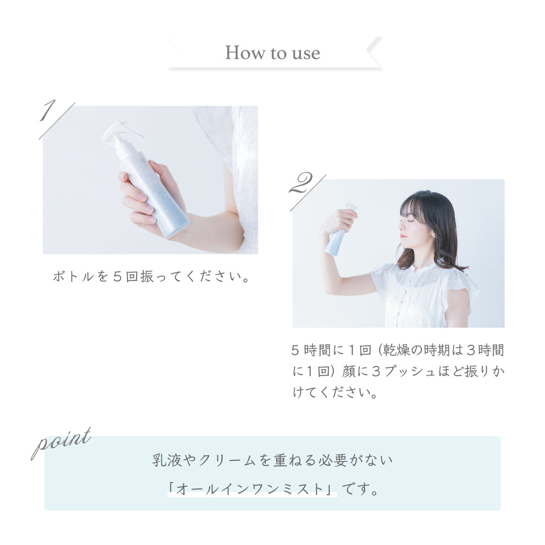 ボトルを必ず5回ほど振ってから洗浄後のお肌に15cmほど離してスプレーし、馴染ませてください。