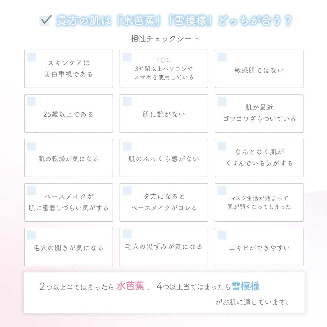 水、グリセリン、フラーレン、酸化セリウム、酵母エキス、ツボクサエキス、レチノール、α-アルブチン、スクワラン、水溶性プロテオグリカン、サトザクラ花エキス、ヒアルロン酸Na、フランスカイガンショウ樹皮エキス、加水分解シロガラシ種子エキス、フユボダイジュ花エキス、カミツレ花エキス、アロエベラ葉エキス、イタドリ根エキス、オウゴン根エキス、カンゾウ根エキス、チャ葉エキス、ローズマリー葉エキス、グリチルリチン酸2K、アラントイン、アスコルビルグルコシド、メタリン酸Na、ユビキノン、ヒノキチオール、イランイラン花油、トコフェロール、アスコルビン酸、BG、DPG、シクロデキストリン、ポリソルベート20、水添ナタネ油アルコール、ミリスチル硫酸Na、バチルアルコール、ステアリン酸スクロース、PVP、エチルへキシルグリセリン、リンゴ酸、クエン酸、クエン酸Na、フェノキシエタノール