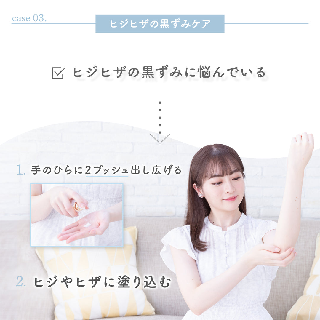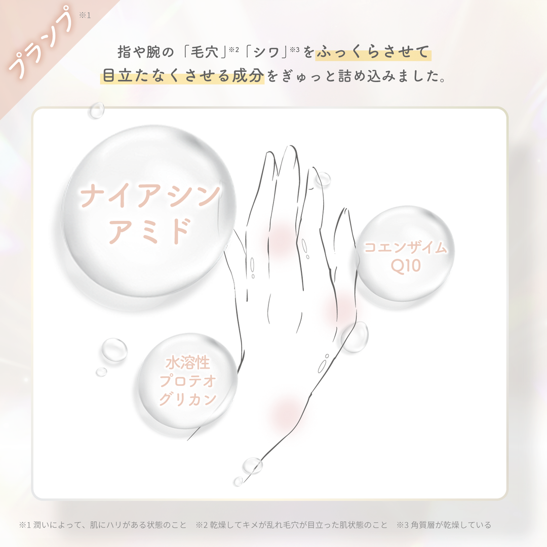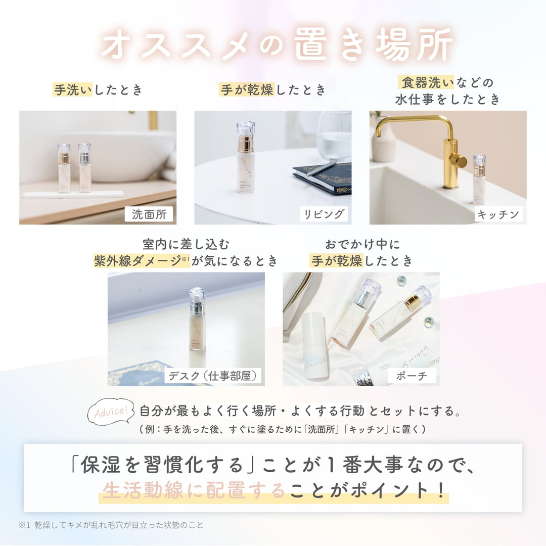 ①ハンドボディ美容液 ②1分ほど時間をおく ③日焼け止め の順番で塗ってください。 |