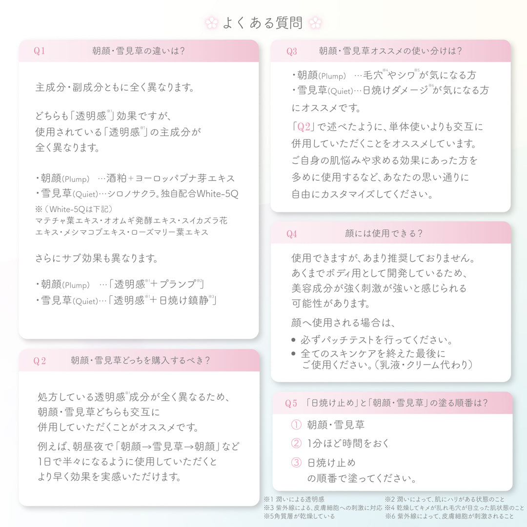 ・朝顔(Plump)・・・毛穴やシワが気になる方 ・雪見草(Quiet)・・・日焼けダメージが気になる方 にオススメです。 単体使いよりも交互に併用していただくことを推奨しております。 ご自身の肌悩みや求める効果に合った方を多めに使用するなど、あなたの思い通りに自由にカスタマイズしてください。 |