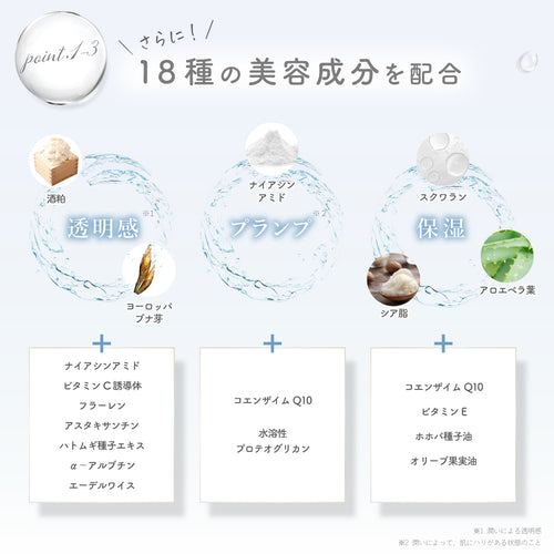 水、グリセリン、DPG、ベタイン、ペンチレングリコール、スクワラン、オリーブ果実油、トリ(カプリル酸/カプリン酸)グリセリル、シア脂、ナイアシンアミド、ミツロウ、酒粕エキス、ヨーロッパブナ芽エキス、アロエベラ葉エキス、水溶性プロテオグリカン、ルイボスエキス、エーデルワイス花/葉エキス、アスタキサンチン、ヘマトコッカスプルビアリスエキス、α-アルブチン、テトラヘキシルデカン酸アスコルビル、フラーレン、ユビキノン、トコフェロール、ホホバ種子油、ハトムギ種子エキス、ツボクサ葉/茎エキス、ベヘニルアルコール、ステアリン酸グリセリル、バチルアルコール、ジメチコン、BG、フェノキシエタノール、アラキジルアルコール、ポリアクリルアミド、(C13,14)イソパラフィン、エチルヘキシルグリセリン、カプリル酸グリセリル、アラキルグルコシド、カルボマー、EDTA-2Na、ラウレス-7、水酸化K、クエン酸Na、クエン酸、PVP、ベルガモット果実油