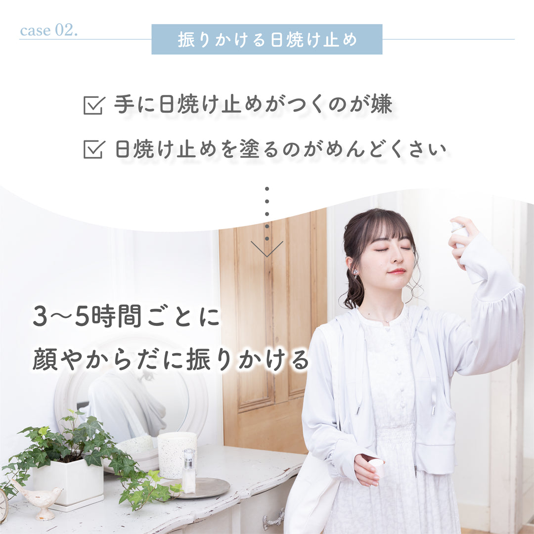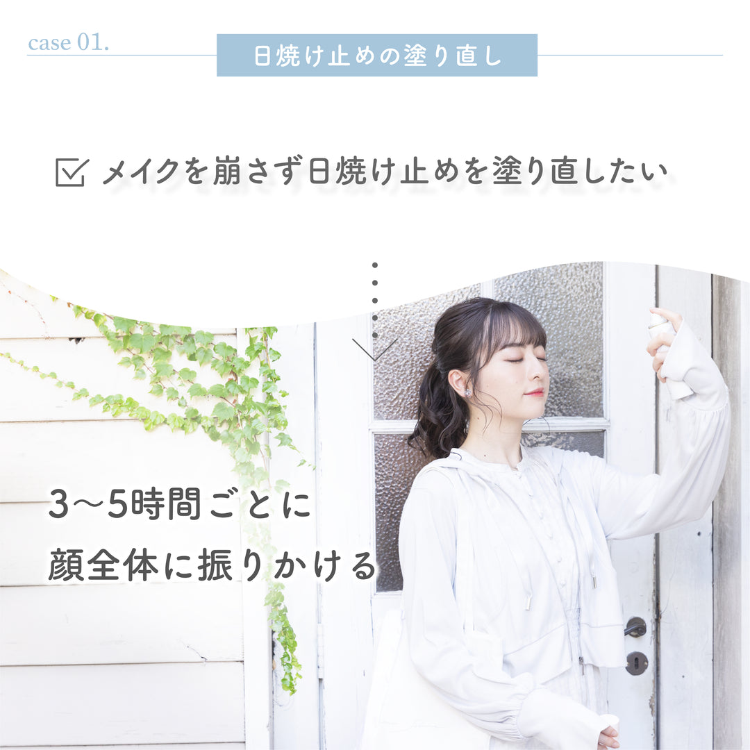 顔に使用する場合は、軽く円を描くようにスプレーし、必ず目と口を閉じて使用してください。