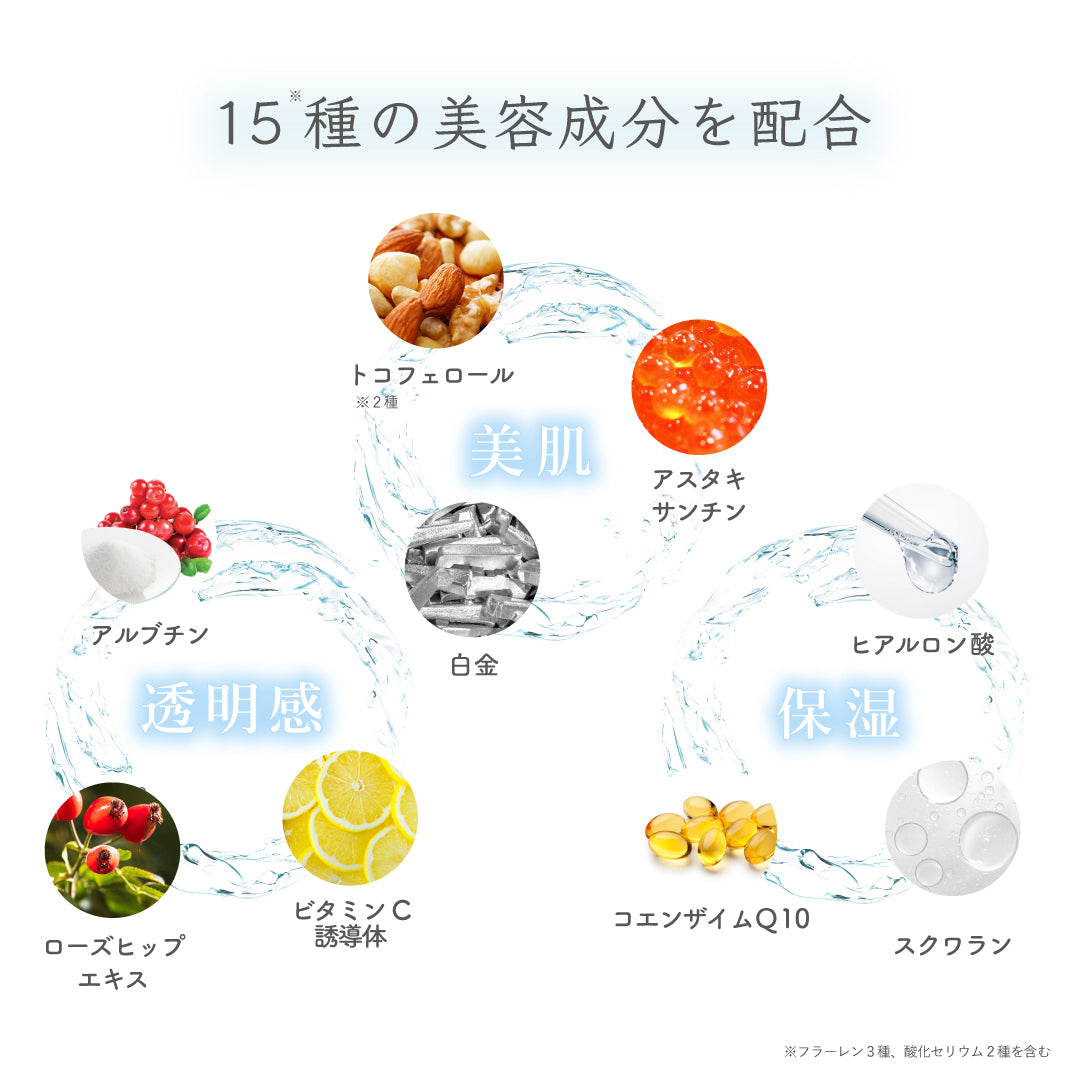 LPG、水、シクロペンタシロキサン、メトキシケイヒ酸エチルへキシル、パルミチン酸エチルへキシル、水添ポリイソブテン、ポリメチルシルセスキオキサン、酸化セリウム、フラーレン、α-アルブチン、アスコルビルリン酸Na、スクワラン、ユビキノン、アスタキサンチン、トリ(カプリル酸/カプリン酸)グリセリル、トコフェロール、ヒアルロン酸Na、白金、カニナバラ果実エキス、酢酸トコフェロール、ジエチルアミノヒドロキシベンゾイル安息香酸へキシル、BG、トリメチルシロキシケイ酸、オクトクリレン、PEG-10ジメチコン、ジステアルジモニウムヘクトライト、PEG/PPG-19/19ジメチコン、オクテニルコハク酸デンプンAI、ビスエチルヘキシルオキシフェノールメトキシフェニルトリアジン、メタリン酸Na、PVP、水添レシチン、PEG-100水添ヒマシ油、トリエチルヘキサノイン、ポリソルベート80、フェノキシエタノール、香料 |