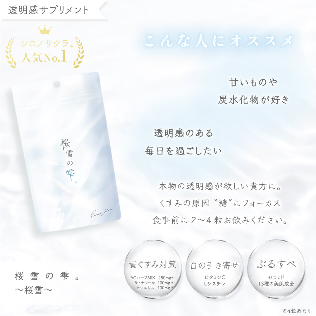 混合ハーブエキス末(デキストリン、混合ハーブ抽出物(ドクダミ、セイヨウサンザシ、ローマカミツレ、ブドウ葉))(国内製造)、混合ハーブ抽出物(デキストリン、フェヌグリーク、フェネル、ハイビスカス)、ヒシエキス末(ヒシ果皮抽出エキス、デキストリン)、黒胡椒抽出物、ローズヒップエキス末(澱粉糖類、ローズヒップ)、トウモロコシ胚芽抽出物、桜の花エキス末/結晶セルロース、HPMC、Lーシスチン、ステアリン酸カルシウム、ビタミンC、二酸化ケイ素、ナイアシン、ビタミンE、パントテン酸カルシウム、ヘマトコッカス藻色素、着色料(トマトリコピン)、ビタミンB2、ビタミンB6、ビタミンB1、ビタミンA、葉酸、ビタミンD3、ビタミンB12