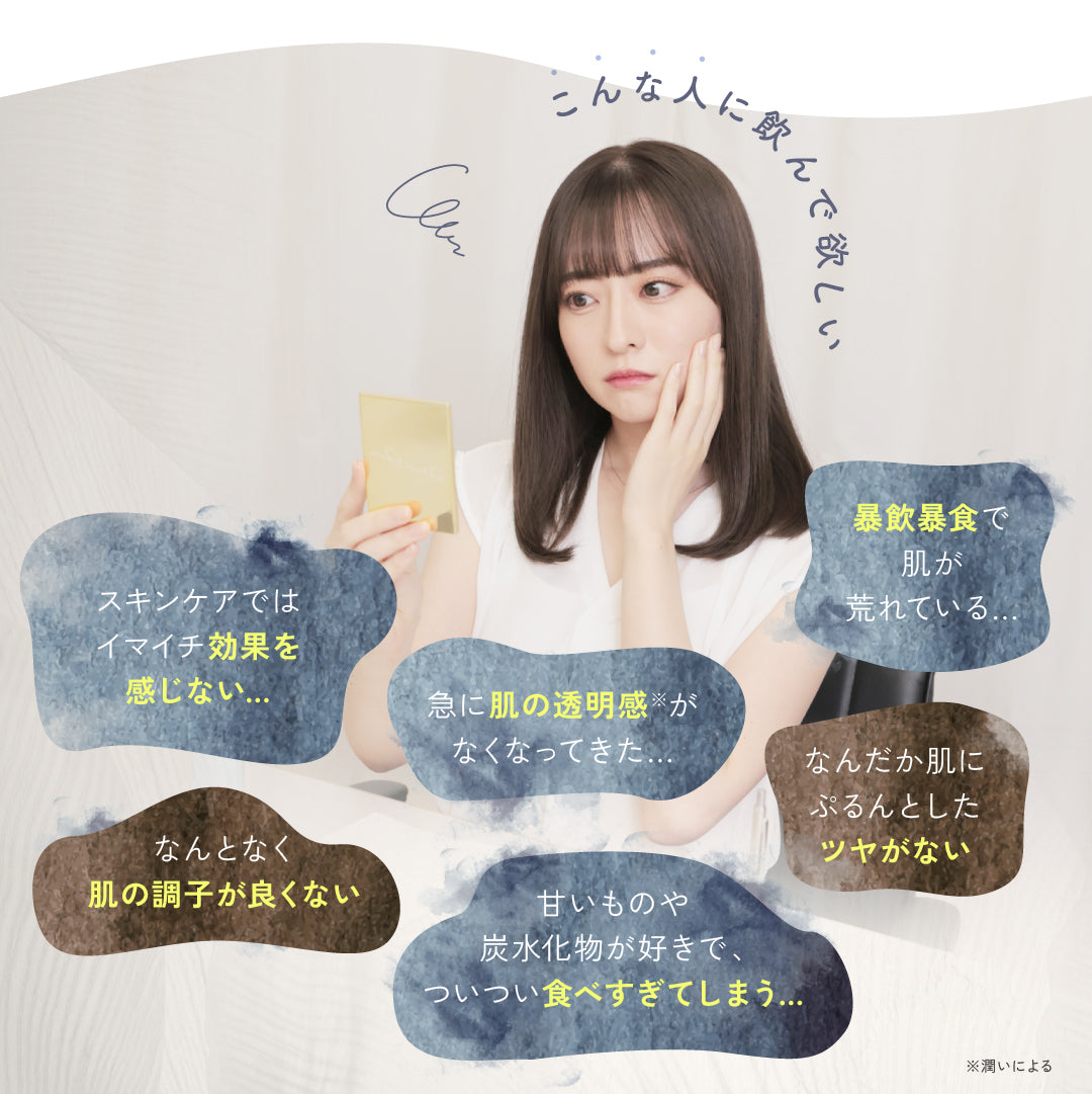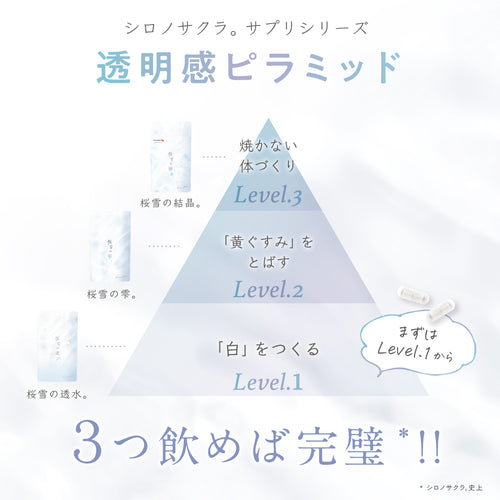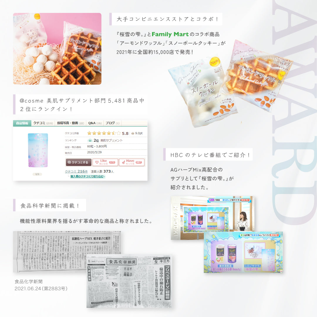 混合ハーブエキス末(デキストリン、混合ハーブ抽出物(ドクダミ、セイヨウサンザシ、ローマカミツレ、ブドウ葉))(国内製造)、混合ハーブ抽出物(デキストリン、フェヌグリーク、フェネル、ハイビスカス)、ヒシエキス末(ヒシ果皮抽出エキス、デキストリン)、黒胡椒抽出物、ローズヒップエキス末(澱粉糖類、ローズヒップ)、トウモロコシ胚芽抽出物、桜の花エキス末/結晶セルロース、HPMC、Lーシスチン、ステアリン酸カルシウム、ビタミンC、二酸化ケイ素、ナイアシン、ビタミンE、パントテン酸カルシウム、ヘマトコッカス藻色素、着色料(トマトリコピン)、ビタミンB2、ビタミンB6、ビタミンB1、ビタミンA、葉酸、ビタミンD3、ビタミンB12