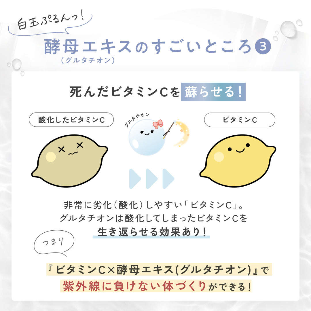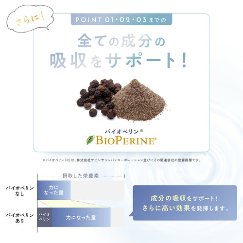 酵母エキス末(国内製造)、黒胡椒抽出物、脂肪酸/ゼラチン、ビタミンC、セルロース、香料、ステアリン酸カルシウム、ヒマワリレシチン、ビタミンP、ビタミンD