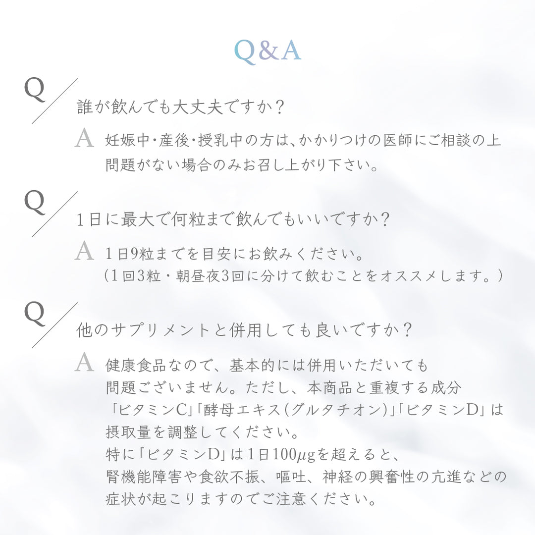 本品は健康食品ですので、他のサプリメントと併用していただいても問題ございませんが、成分をご確認の上、成分に重複があれば摂取量を調整してご利用ください。お薬を服用中の方、あるいは通院中の方は、念のため、かかりつけの医師にご相談の上、問題がない場合のみお召し上がりください。