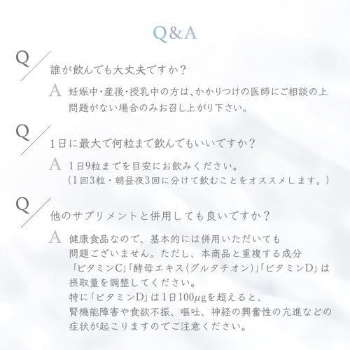 一度に推奨量を上回る量を摂取したからといって、健康が増進するものではありません。1日に最大で9粒ほどを目安とし、継続して摂取していただくことをオススメしております。