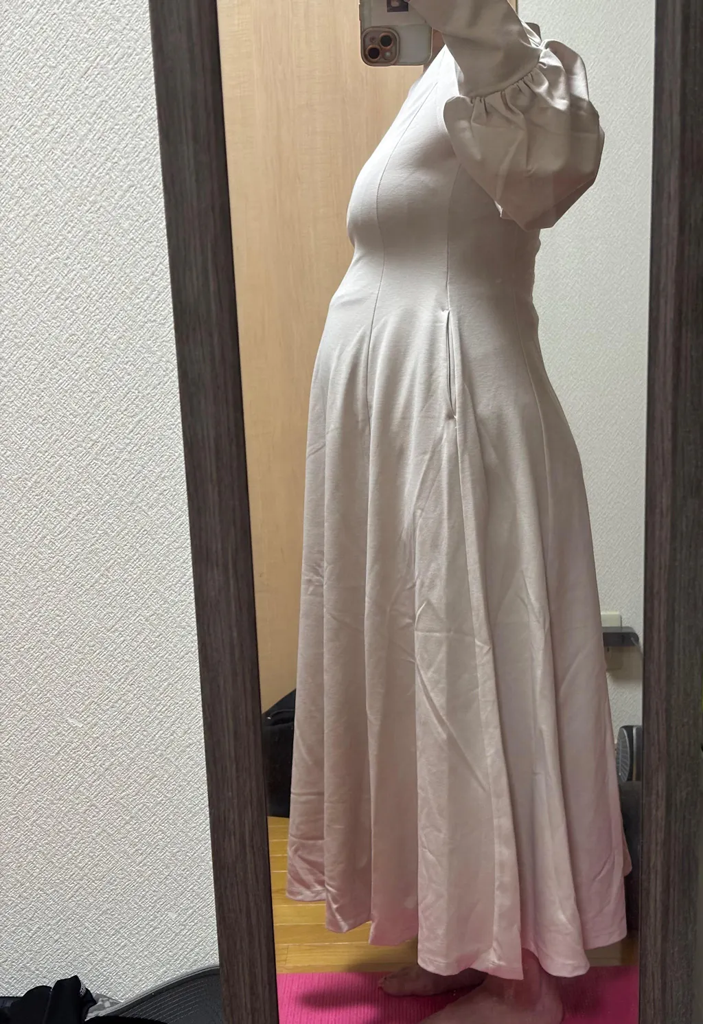 購入時、9ヶ月妊婦です。インスタライブで定番化か聞いたら戯ちゃん。が「分からない」とおっしゃっていて、そらそうだよな、まず売れなきゃ作れないよなってことで普段なら数色買いするんだけど今回は1着だけミルクティーのフリーサイズを買いました。入らなくても産後に着れたら万々歳🫱🏻🫲🏼ということで(笑)届いて試しに着てみたら入った✨腕周りは全然苦しくなくて、逆に少し大きく感じるくらいだけど、バストはやっぱりキツかった、、妊娠前に着ていた半袖タイプもフリーサイズでバストピタピタだったから今回入ったことに驚き😳😳伸縮性に優れていると思います。