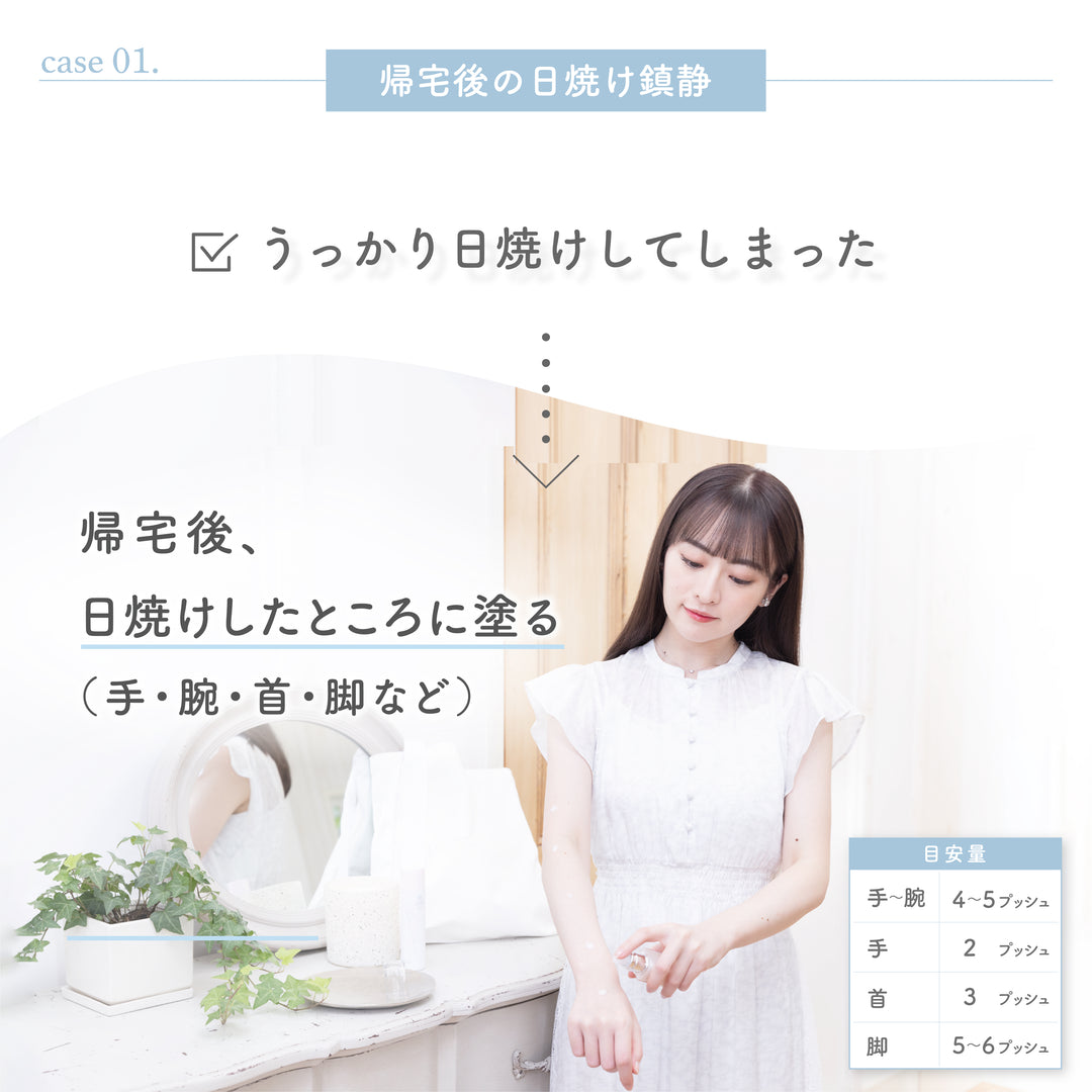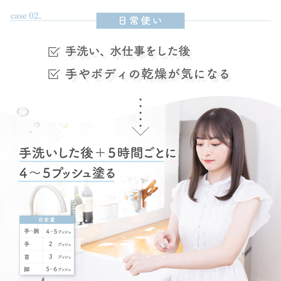 ①ハンドボディ美容液 ②1分ほど時間をおく ③日焼け止め の順番で塗ってください。 |