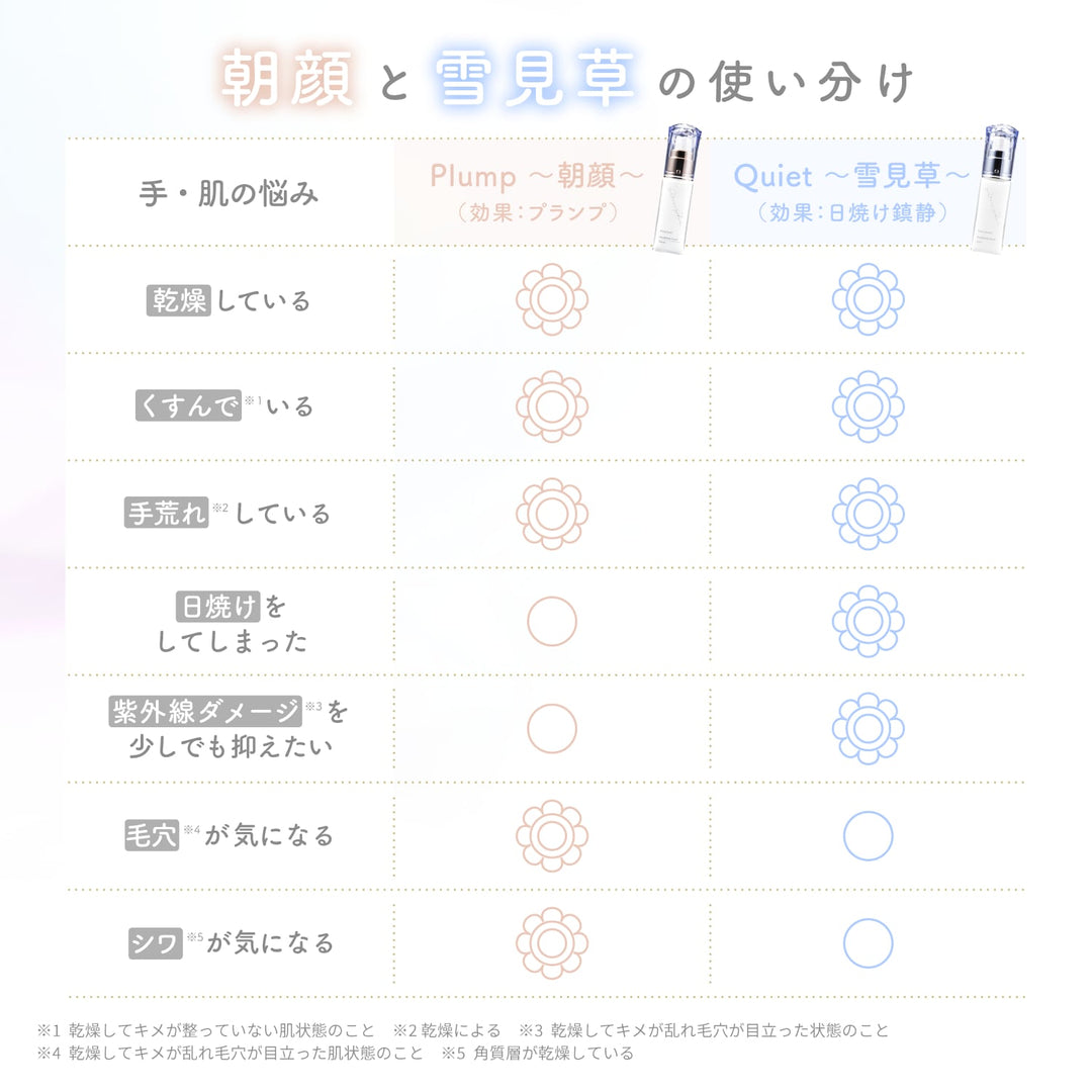 ・朝顔(Plump)・・・毛穴やシワが気になる方 ・雪見草(Quiet)・・・日焼けダメージが気になる方 にオススメです。 単体使いよりも交互に併用していただくことを推奨しております。 ご自身の肌悩みや求める効果に合った方を多めに使用するなど、あなたの思い通りに自由にカスタマイズしてください。 |